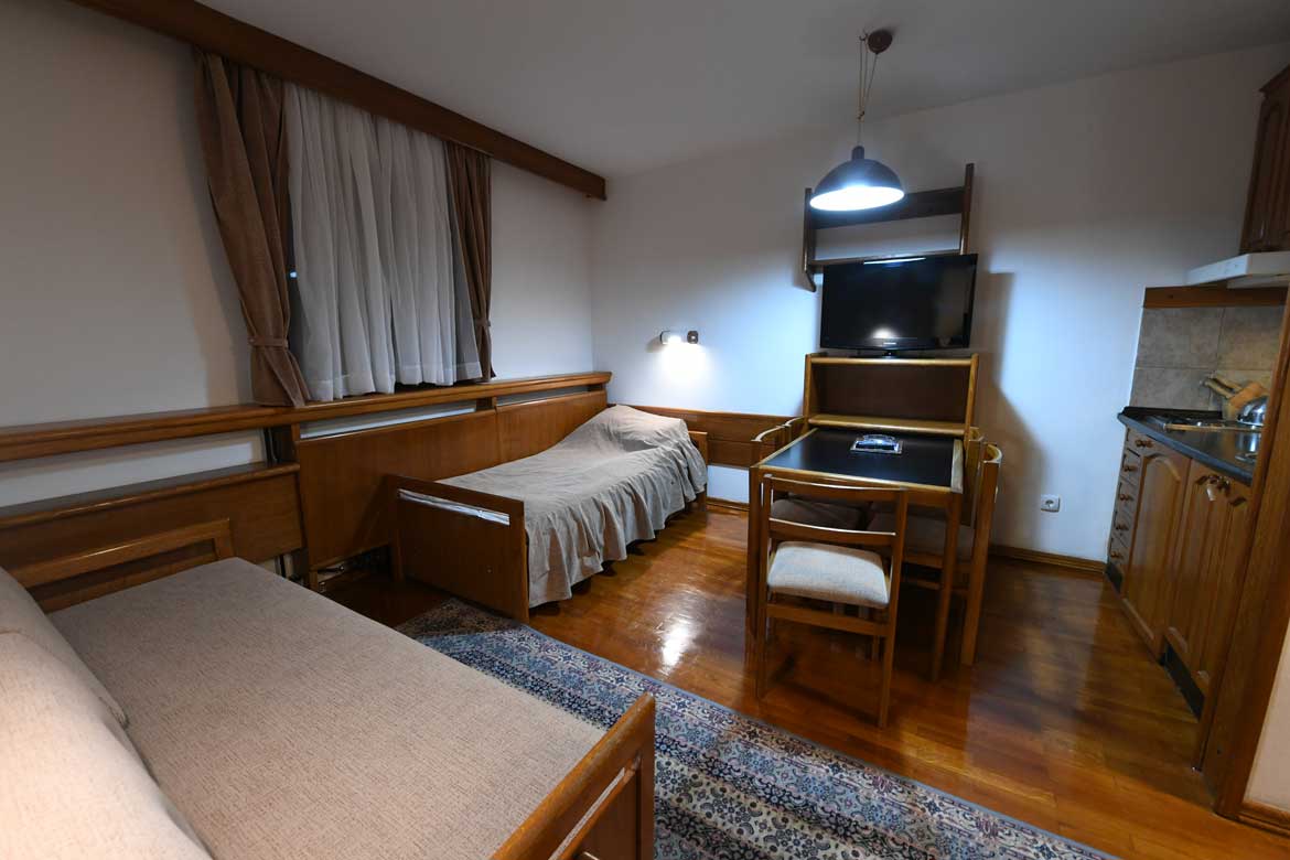 Francuski i singl krevet u spavaćoj sobi, a u dnevnom boravku trosed na rasklapanje za dve osobe (maks 5 osoba).